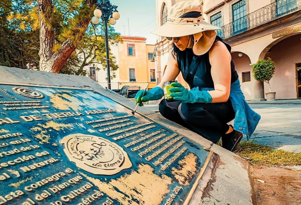 El ayuntamiento de San Luis Potosí, a través del área de Restauración, Patrimonio Cultural y Proyectos, de la Unidad de Gestión del Centro Histórico, realiza mantenimiento a la placa conmemorativa del Camino Real de Tierra Adentro, en la que se aplicó pintura y se limpió para evitar el deterioro de esta pieza que da fe de la Ruta de la Plata que cruzó por nuestra ciudad.