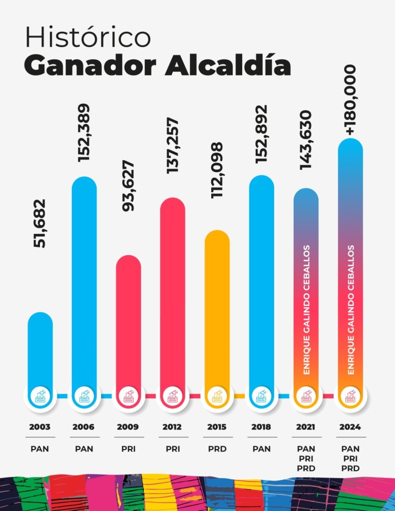 La votación registrada en el PREP hasta su cierre es de más de 171 mil votos en favor de Enrique Galindo Ceballos, aún a falta de contabilizar el 13.1 por ciento de las actas de la elección. De acuerdo con las cifras obtenidas hasta el momento y la tendencia marcada en el PREP, la amplia ventaja de Galindo Ceballos sobre su más cercana perseguidora se mantendrá.