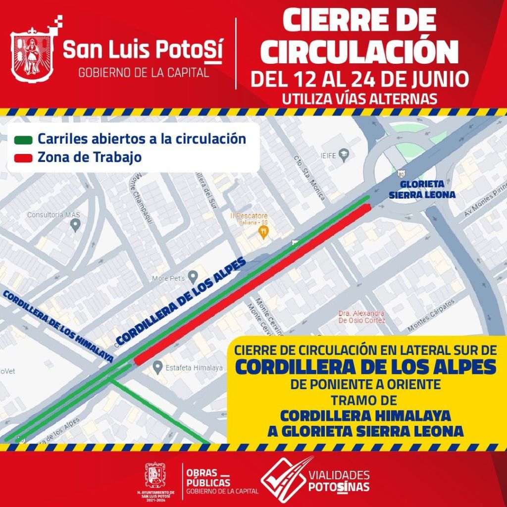 El Gobierno Municipal de San Luis Potosí, a través de la Dirección de Obras Públicas, informa a la ciudadanía que será cerrada a la circulación de forma temporal la vía lateral de Cordillera de Los Alpes, en el sentido de poniente a oriente, debido a trabajos de reconstrucción del pavimento como parte de las obras complementarias del Puente Inferior Vehicular Alpes- Himalaya.