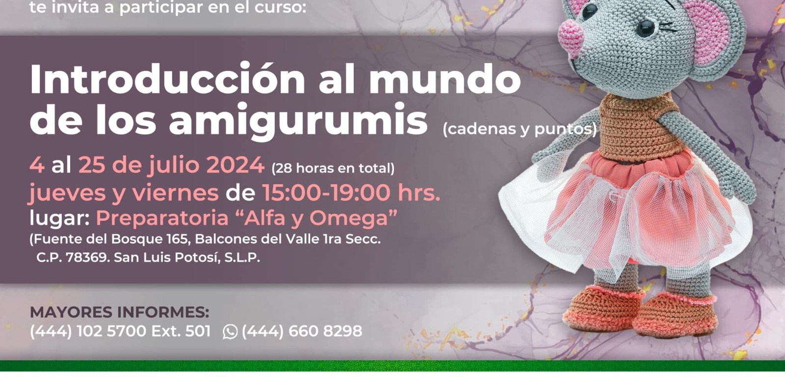 Flores Saldierna, detalló que el curso de amigurumis, se desarrollará del 4 al 25 de julio los días jueves y viernes de 15:00 a 19:00 hrs, en la preparatoria “Alfa y Omega” ubicada en Fuente del Bosque 165, Balcones del Valle.