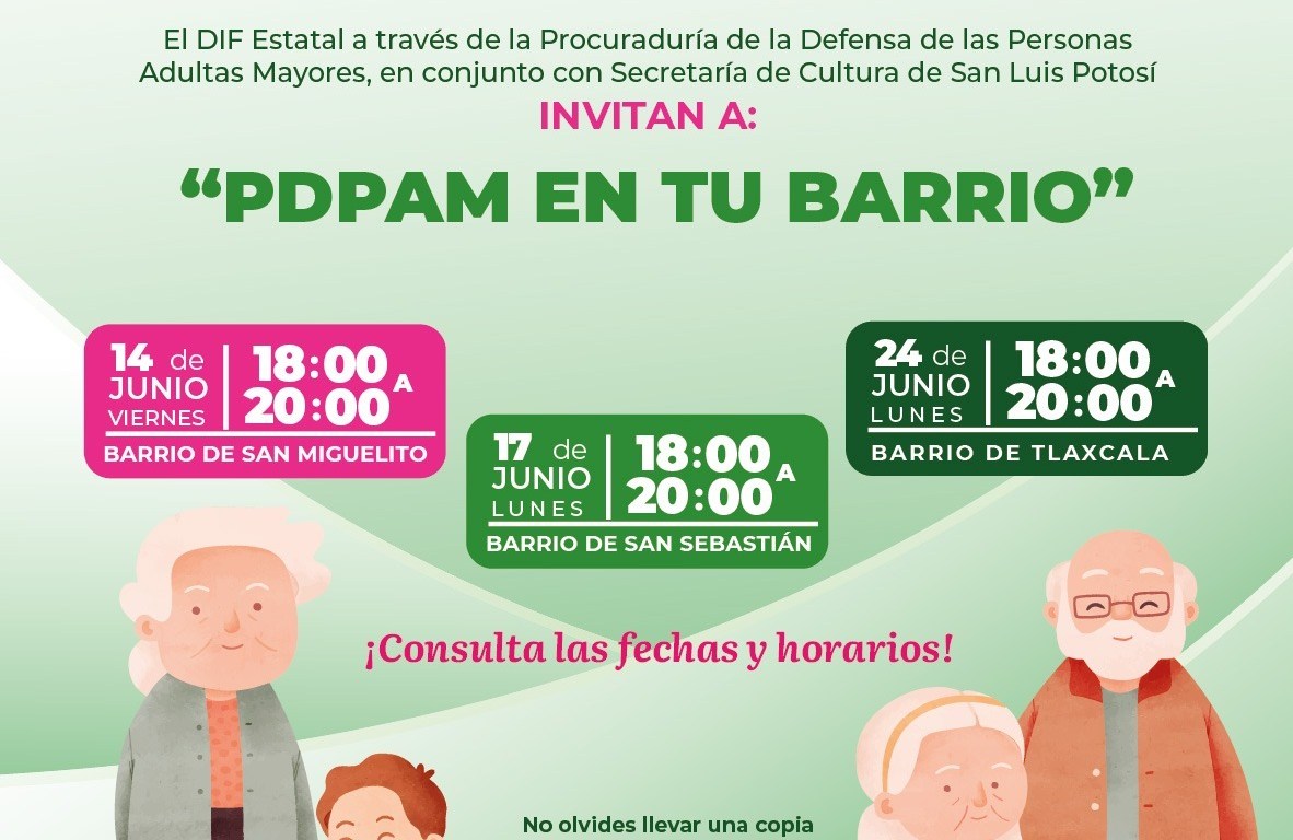 En el marco del “Día Mundial de Toma de Conciencia del Abuso y Maltrato en la Vejez”, el Sistema Estatal para el Desarrollo Integral de la Familia (DIF), a través de la Procuraduría de la Defensa de las Personas Adultas Mayores (PDPAM), visitará las casas de cultura de los barrios de San Miguelito, San Sebastián y Tlaxcala, para ofrecer pláticas de prevención de violencia y asesorías gratuitas en materia jurídica y de trabajo social a la personas adultas mayores.