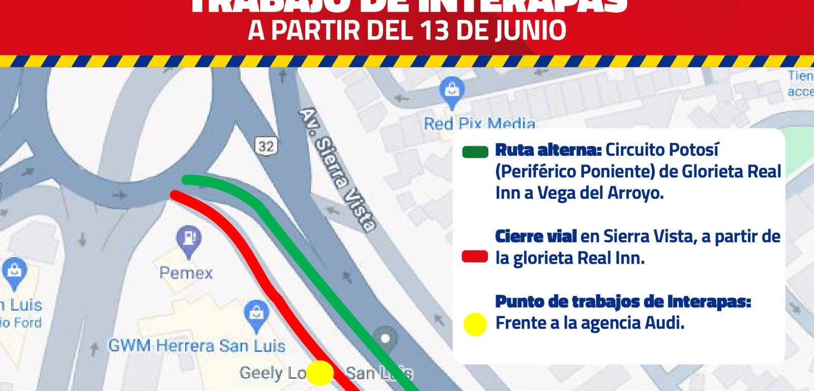 Al ser una zona altamente transitada, la Dirección General de Policía y Movilidad ha habilitado como ruta alterna el tramo de Circuito Potosí de glorieta Real Inn a calle Vega del Arroyo.