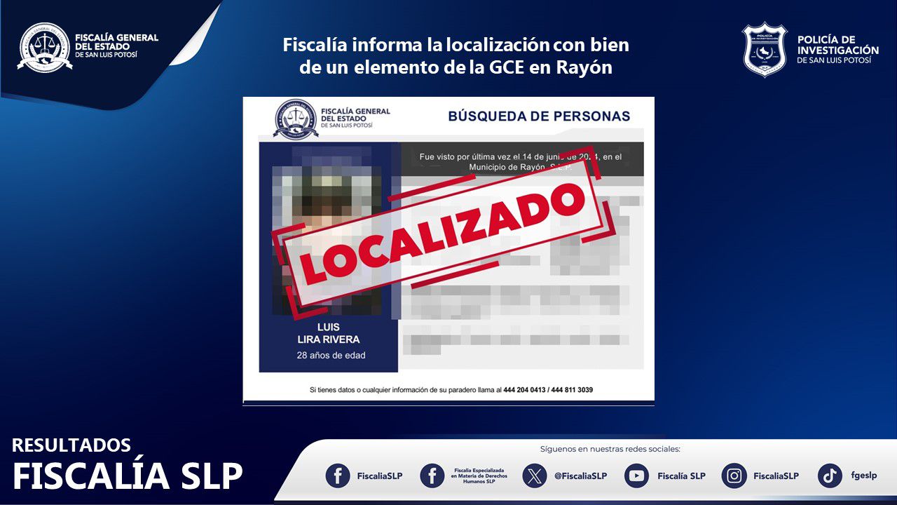 Actualmente Lira Rivera se encuentra en oficinas de la FGESLP rindiendo su declaración por su ausencia desde el día de la fecha hasta ahora en el municipio de Rayón, y pronto regresará con sus familiares.