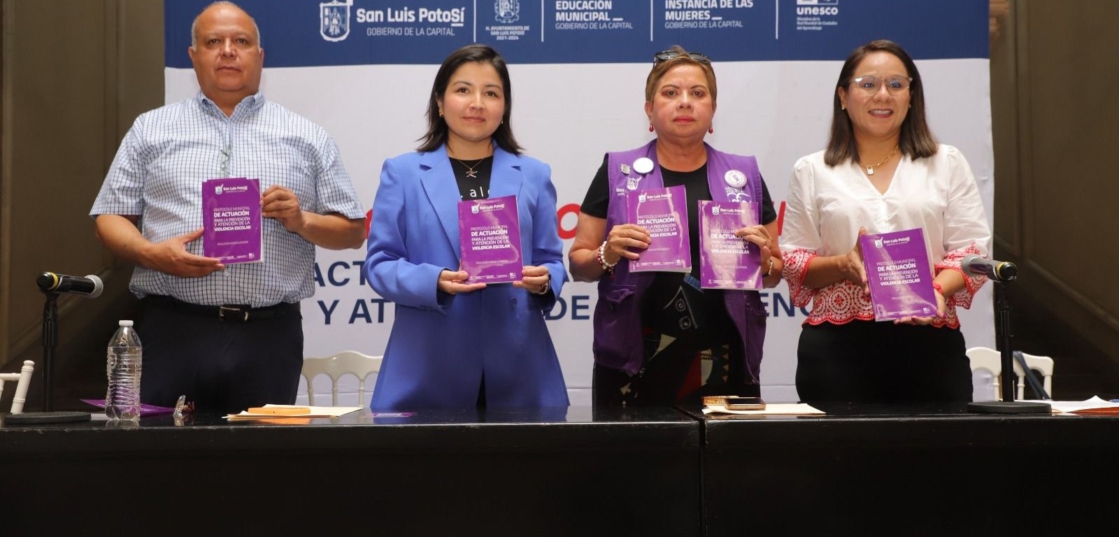 Ante directivos y docentes de las Escuelas Municipales que pertenecen al sistema educativo del Ayuntamiento de San Luis Capital, autoridades presentaron el Protocolo Municipal para la Prevención y Atención de la Violencia Escolar, que se aplicará en los planteles que imparten educación básica y educación media superior.