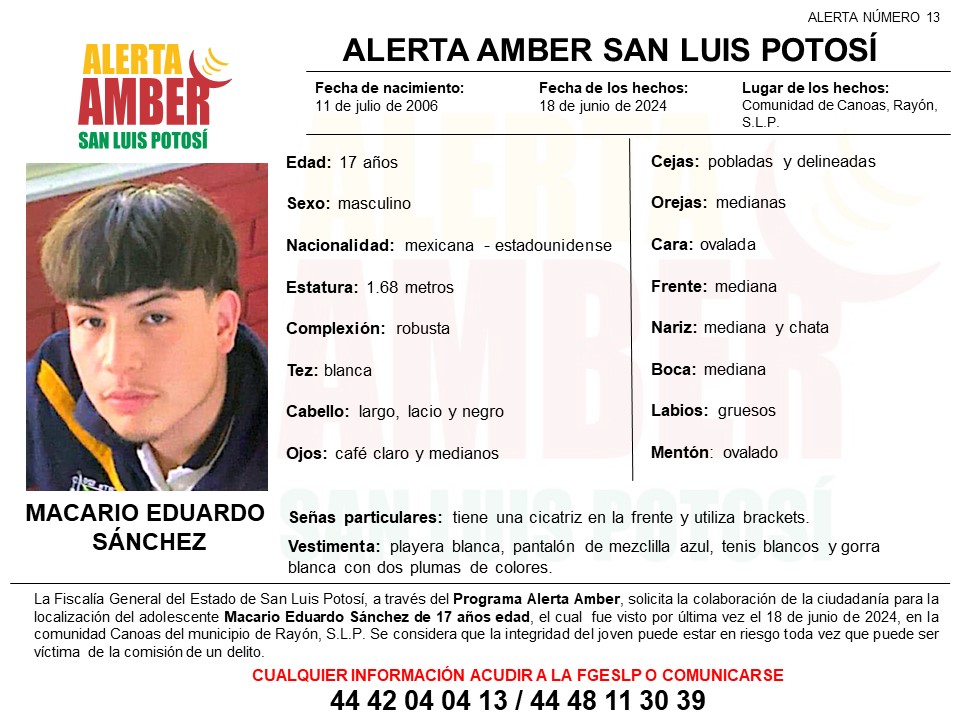 La Fiscalía General del Estado de San Luis Potosí (FGESLP) activó una Alerta Amber para ubicar a Macario Eduardo Sánchez, un adolescente de 17 años de edad.
