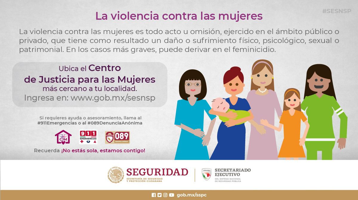 Resaltó que la campaña, que se realiza en coordinación con el Centro Nacional de Prevención del Delito y Participación Ciudadana, y la Comisión Nacional para Prevenir y Erradicar la Violencia contra las Mujeres (Conavim), consta de imágenes ilustrativas con distintas situaciones además de brindar información de las funciones de los Centros de Justicia para las Mujeres, así como los servicios gratuitos como atención psicológica y médica, asesoría legal, trabajo social, empoderamiento, refugio temporal y ludoteca.
