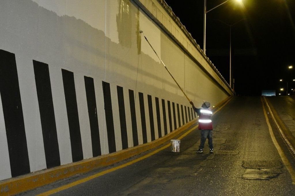 La Coordinación de Imagen Urbana del Ayuntamiento de la Capital continúa con los trabajos para mantener la ciudad limpia y segura, ahora en el paso a desnivel de Sierra Leona, donde personal de la dependencia realiza tareas de pintura, delineado y limpieza general.