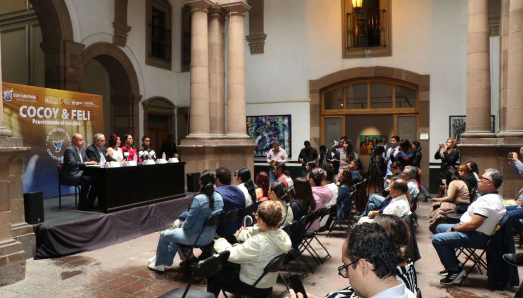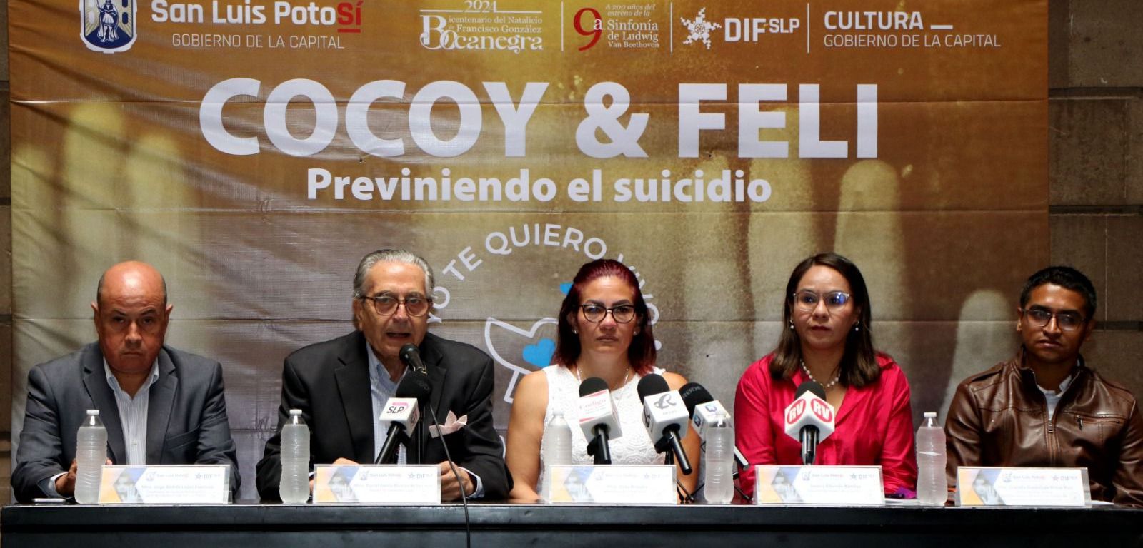 Daniel García Álvarez de La Llera, Director de Cultura Municipal; Jessica Albarrán Ramírez, Directora del Sistema Municipal DIF; Jorge Andrés López Espinosa, Coordinador de los Derechos Humanos del H. Ayuntamiento de San Luis Potosí; Vicky Brizuela, Presidenta de la Asociación “Cocoy & Feli” y José Alberto Ramos Zamarripa, Coordinador de Enseñanza e Investigación del Instituto Temazcalli; presentaron ante los medios de comunicación la Asociación “Cocoy & Feli, Previniendo el Suicidio”, en rueda de prensa llevada a cabo en el Palacio Municipal.