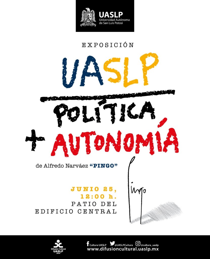 La Universidad Autónoma de San Luis Potosí (UASLP) a través de la Secretaría de Difusión Cultural, invita a la apertura de la exposición “UASLP entre política más autonomía” que, por primera vez, exhibirá más de un centenar de viñetas del caricaturista Alfredo Narváez Ochoa “Pingo”, cuya trayectoria abarca casi cuatro décadas de labor periodística.