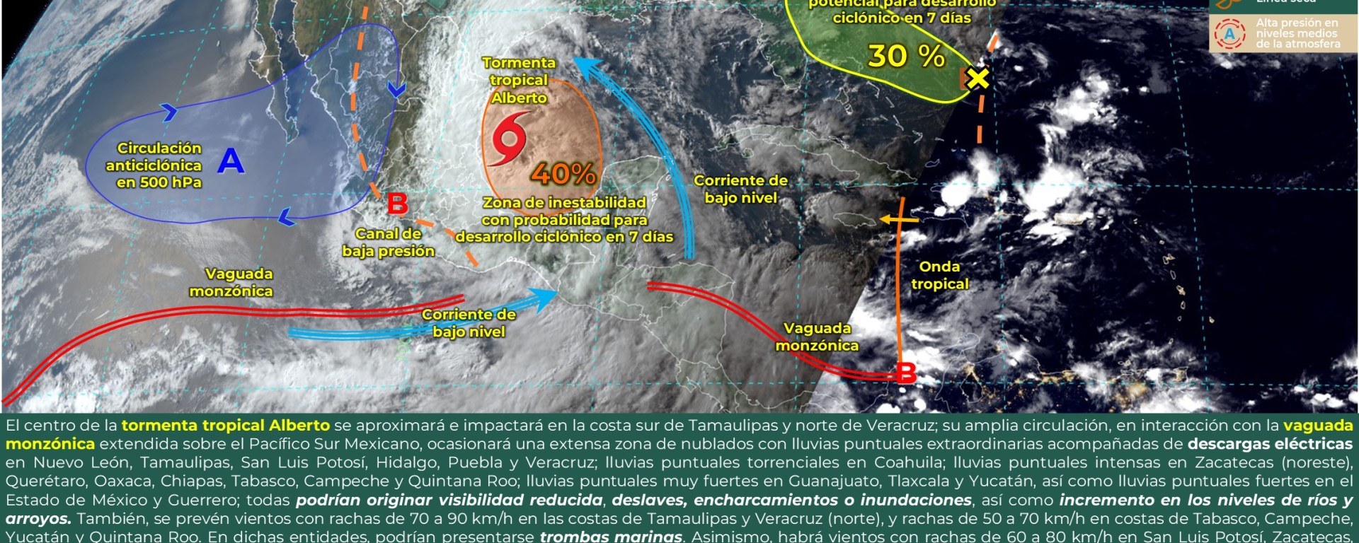Viento con rachas de 50 a 70 km/h: Sonora, Chihuahua, Sinaloa, Nayarit, Jalisco, Aguascalientes y Guanajuato; y con posibles tolvaneras: Baja California y Baja California Sur.