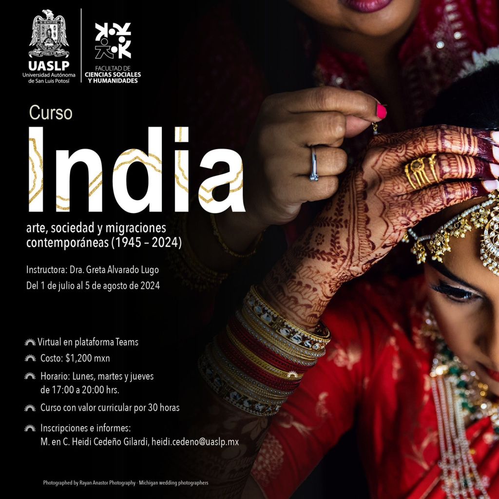 La Universidad Autónoma de San Luis Potosí (UASLP), a través de Educación Continua de la Facultad de Ciencias Sociales y Humanidades (FCSyH), invita al curso «India: arte, sociedad y migraciones contemporáneas (1945-2024)», impartido por la doctora Greta Alvarado Lugo.
