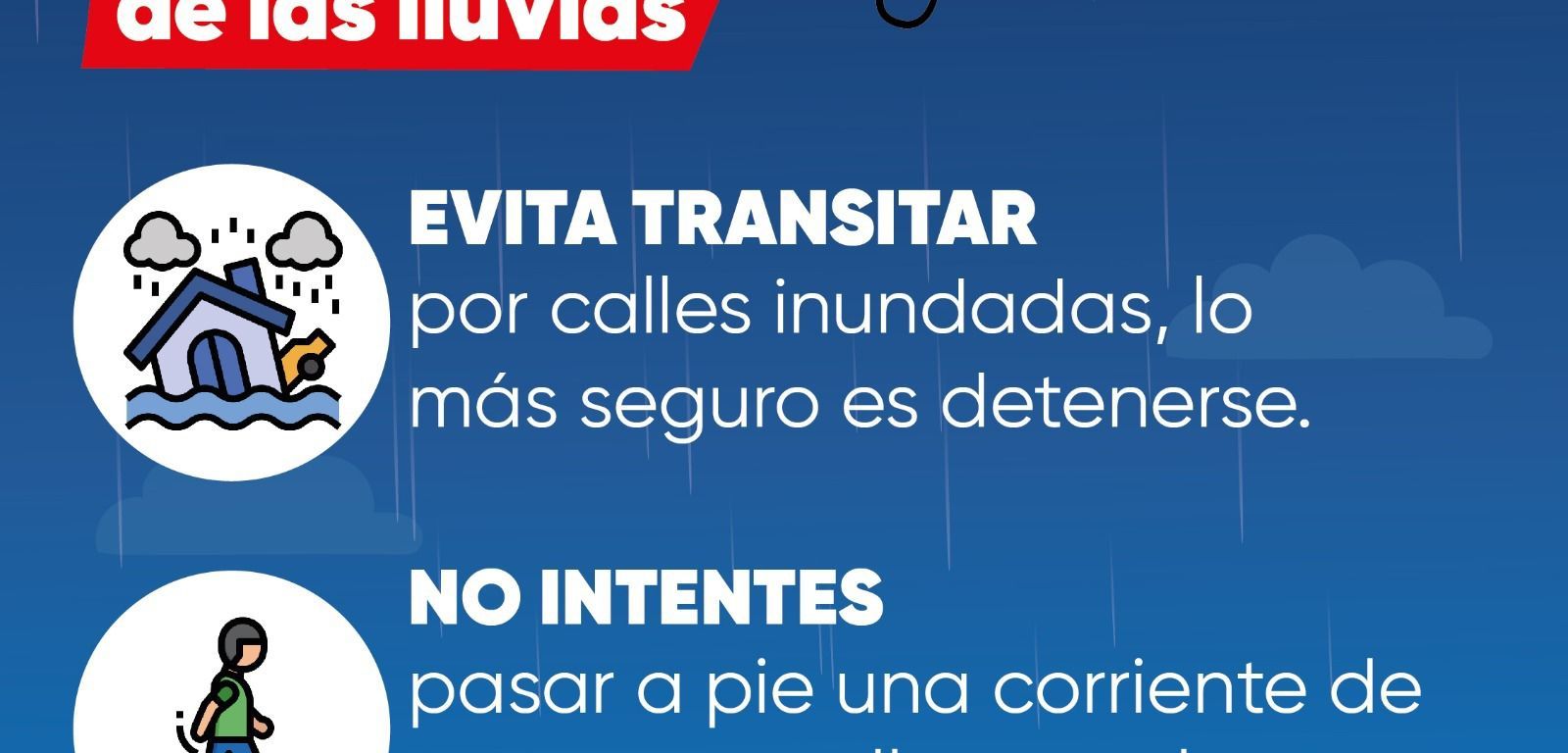 La dependencia recomienda evitar transitar en vehículos de motor por calles inundadas, lo más seguro es detenerse; así como no intentar pasar a pie una corriente donde el agua llegue a las rodillas.