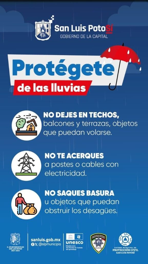 Asimismo, Protección Civil Municipal exhorta a las potosinas y potosinos alejarse de árboles, ya que hay ramas que podrían romperse y caer; no pasar por debajo de andamios o edificios en construcción; apartarse de postes, cableado eléctrico, así como de espectaculares que puedan caer.