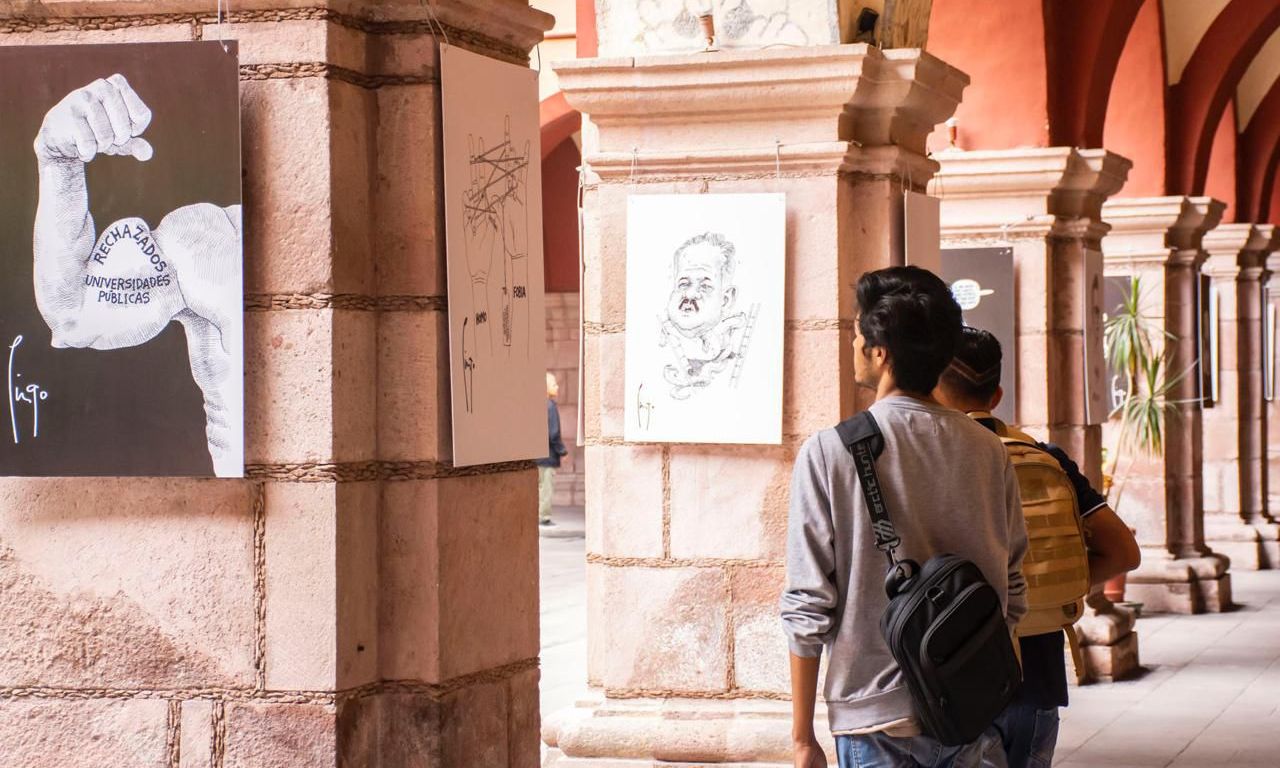 Respecto a la elección de las imágenes para la exhibición, el caricaturista comentó que “primero, elegí a cinco rectores que han dirigido la universidad, asignando dos caricaturas a cada uno para equilibrar la representación, también hay dibujos sobre la autonomía universitaria, la Federación Universitaria Potosina, ingresos y egresos, entre otros”.