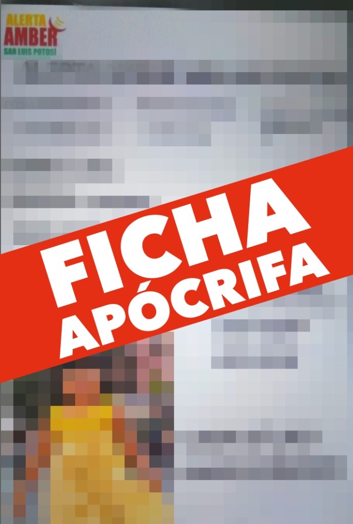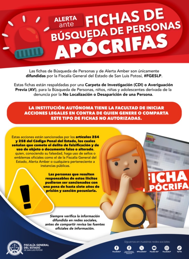 La Fiscalía General del Estado de San Luis Potosí (FGESLP) alerta a la ciudadanía sobre la circulación de una ficha de Alerta Amber falsa, además exhorta a no realizar o difundir este tipo de Fichas de Búsqueda de Personas apócrifas ya que constituye un delito.