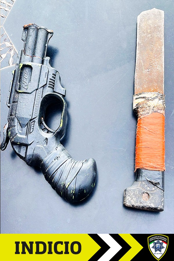 Una vez que el sujeto fue ubicado, se le confiscaron cuatro tornillos metálicos de aproximadamente 20cm, cinco clavos metálicos de aproximadamente 17cm, además de un cuchillo con empuñadura de plástico cubierta de cinta en color naranja, de aproximadamente 12cm y hoja metálica de 12 centímetros, así como una réplica de arma de fuego en color negro.