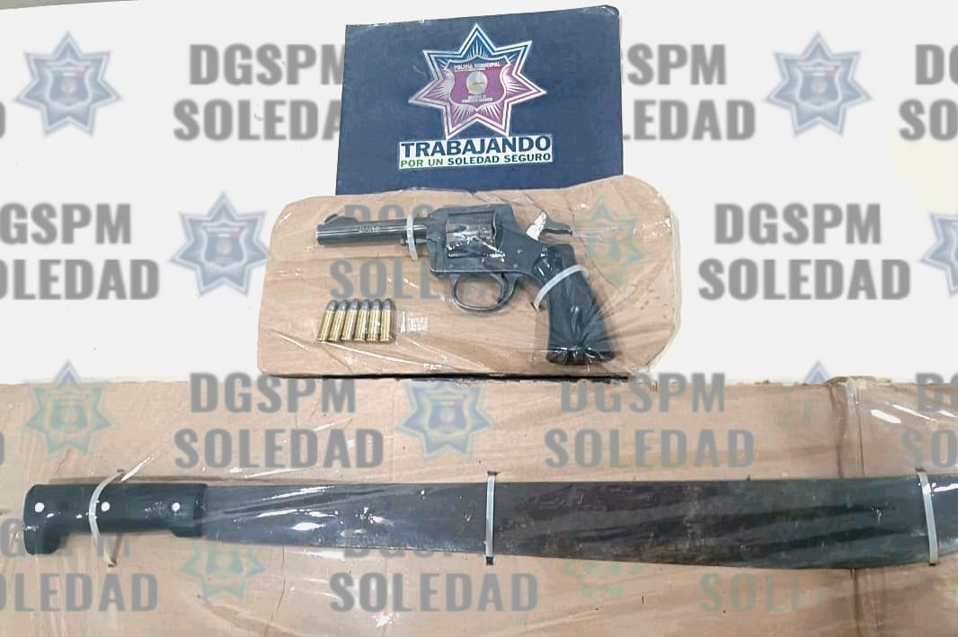 Derivado de la atención inmediata que se brindó a un reporte ciudadano, oficiales de Seguridad Pública de Soledad de Graciano Sánchez detuvieron a dos hombres, uno por presunta portación de arma blanca, y otro por posesión de arma de fuego y arma blanca; además, de ejercer agresión a la autoridad y daños a una patrulla de la corporación, en la colonia San Lorenzo.