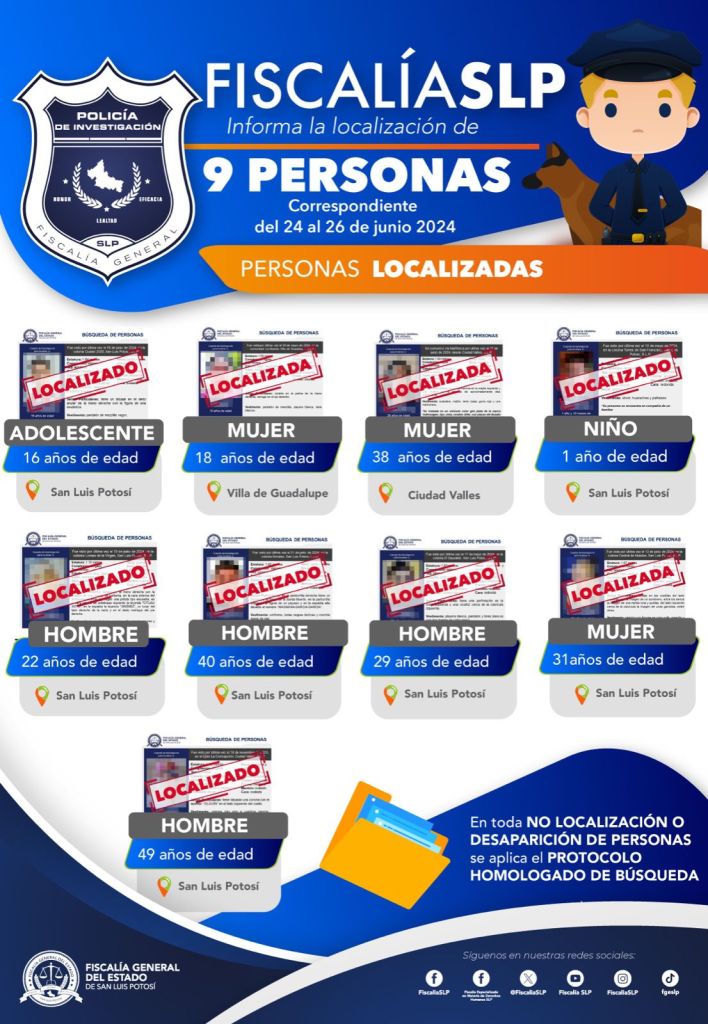 La Fiscalía General del Estado de San Luis Potosí (FGESLP) informa que en las últimas horas localizó a nueve personas en las regiones centro y huasteca de la entidad, como parte del trabajo implementado por la Policía de Investigación (PDI).