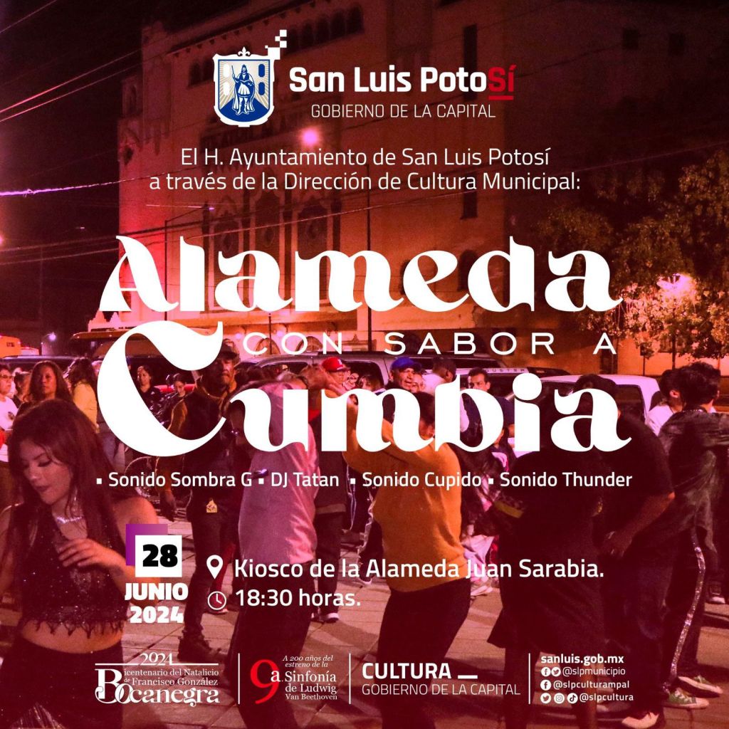 El gobierno municipal a través de la dirección de Cultura, invitan a la población en general a disfrutar de “Alameda con sabor a cumbia”, que se celebra este viernes 28 de junio en el corazón de San Luis Capital.