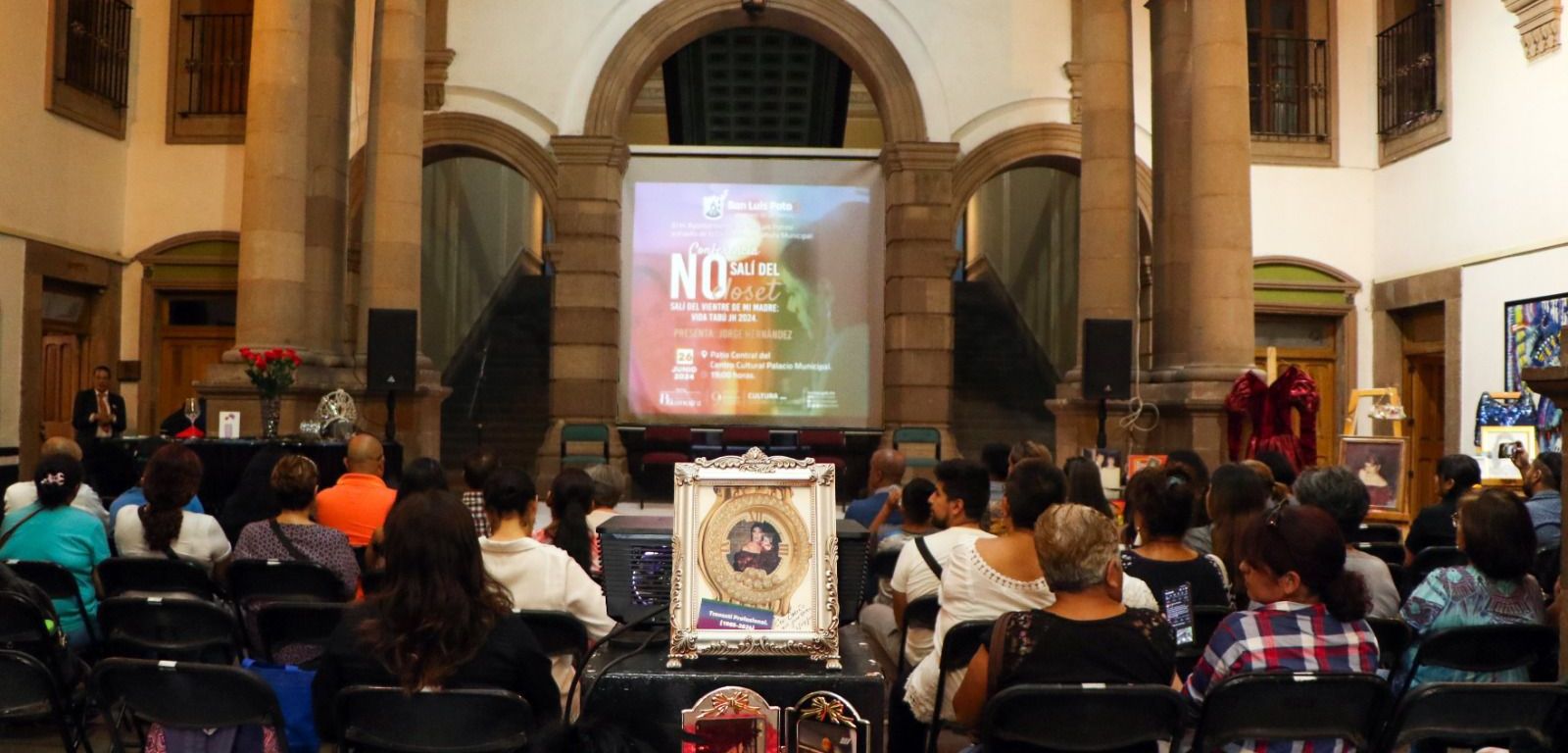 El Centro Cultural Palacio Municipal reunió a un gran número de asistentes a la ponencia que invita a la emancipación y respeto de la comunidad LGBTQIA+, en la que el autor narra su propia historia de vida, así como su trayectoria para convertirse en uno de los primeros artistas trans en San Luis Potosí. En la exposición, Jorge Hernández hizo un recorrido histórico, social y cultural, sobre la evolución que ha tenido la comunidad desde los años 60 hasta la actualidad.