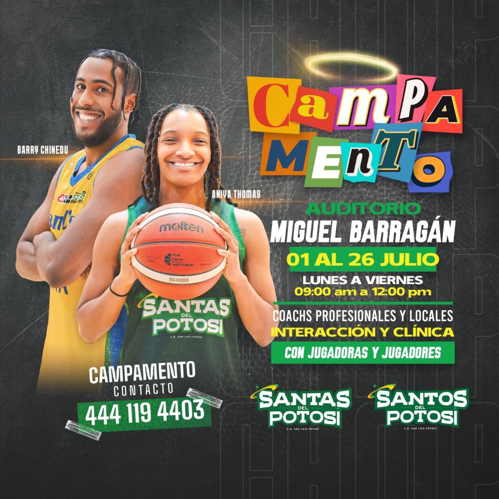 Derivado del impulso a todas las disciplinas deportivas y al rescate del baloncesto profesional en San Luis Potosí por parte del Gobierno del Estado, el equipo “Santos del Potosí”, realizará del primero al 26 de julio de 2024, un campamento de verano infantil en las modalidades semanal, parcial o total, dirigido a niñas, niños y jóvenes de entre seis y 16 años, que podrán convivir con las y los jugadores profesionales de los equipos femenil y varonil.