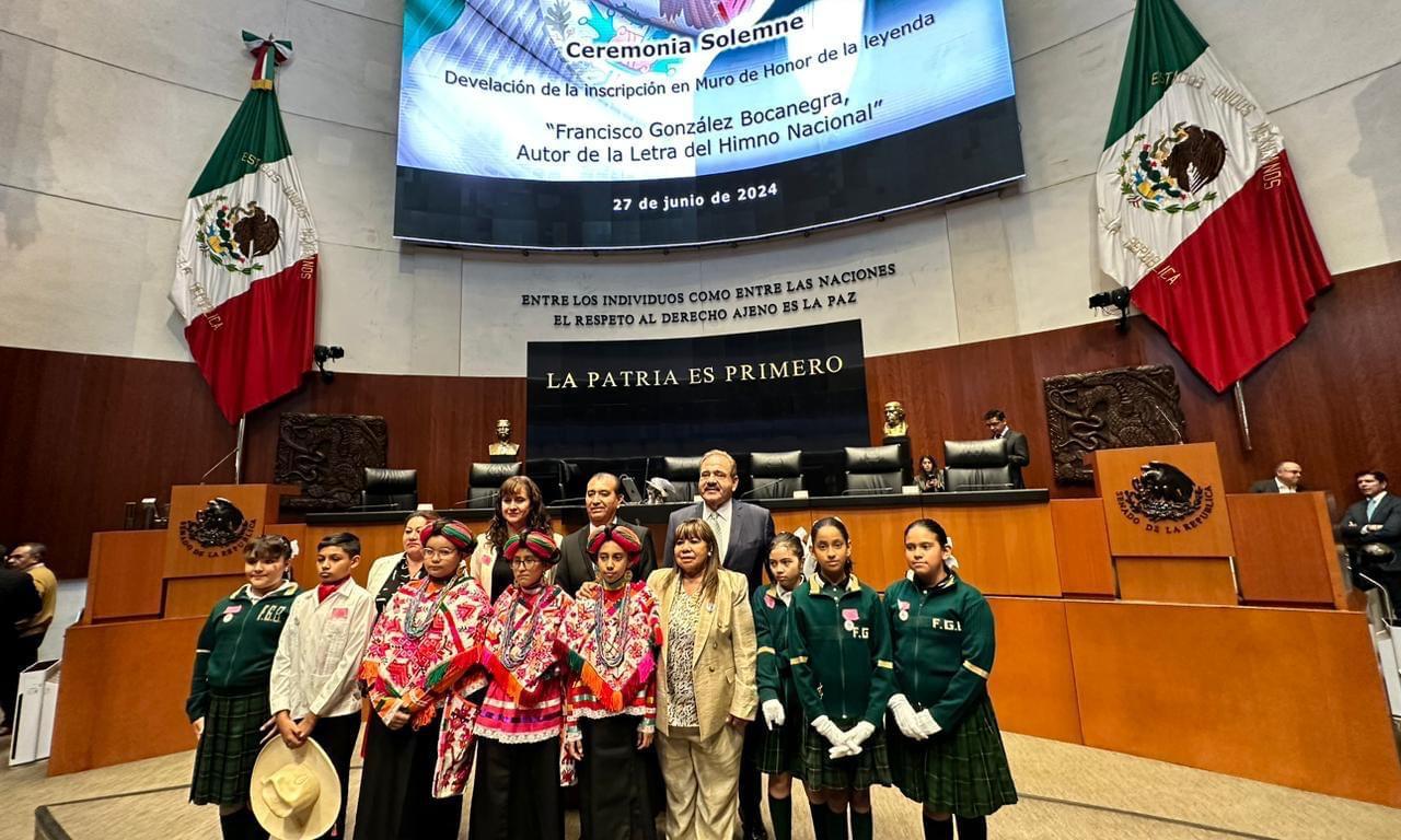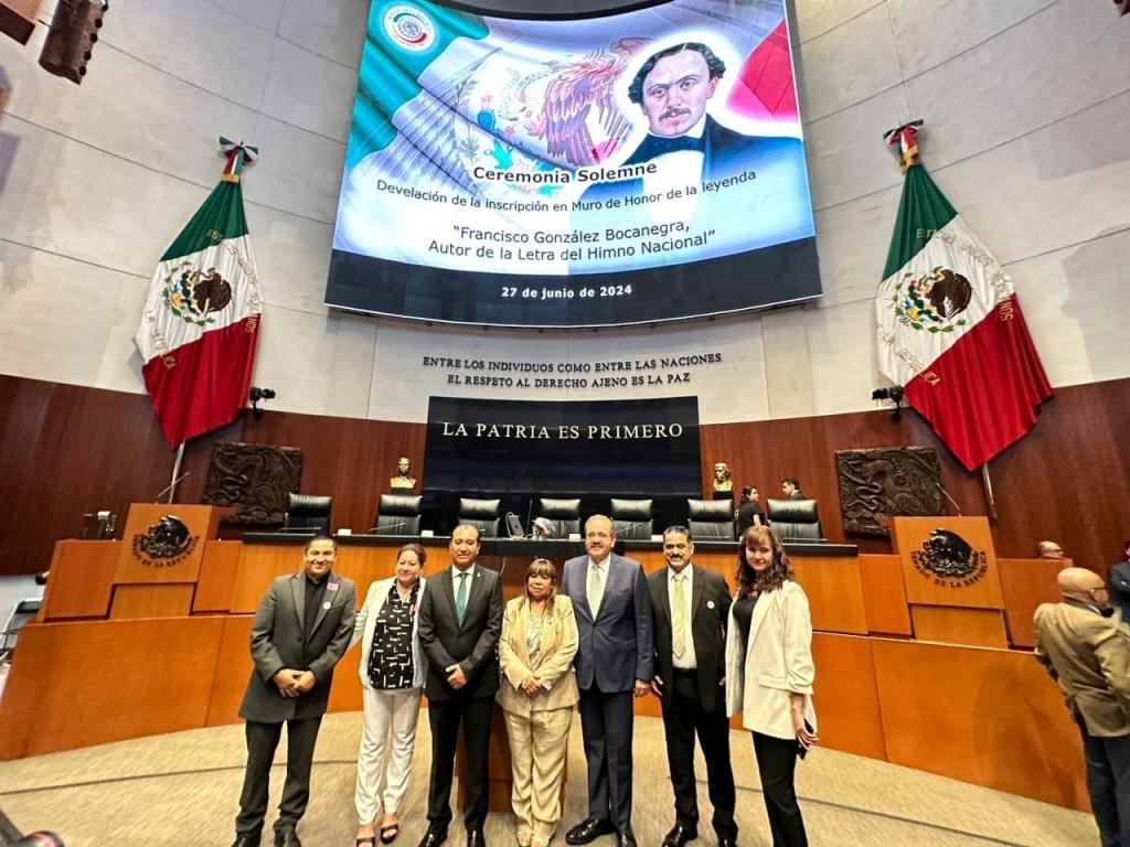 Como parte de la iniciativa promovida por la senadora Graciela Gaitán Díaz para reconocer la aportación del potosino Francisco González Bocanegra al país, este jueves el Senado de la República rindió homenaje al potosino, autor del Himno Nacional Mexicano, al inscribir su nombre en el Muro de Honor del recinto.