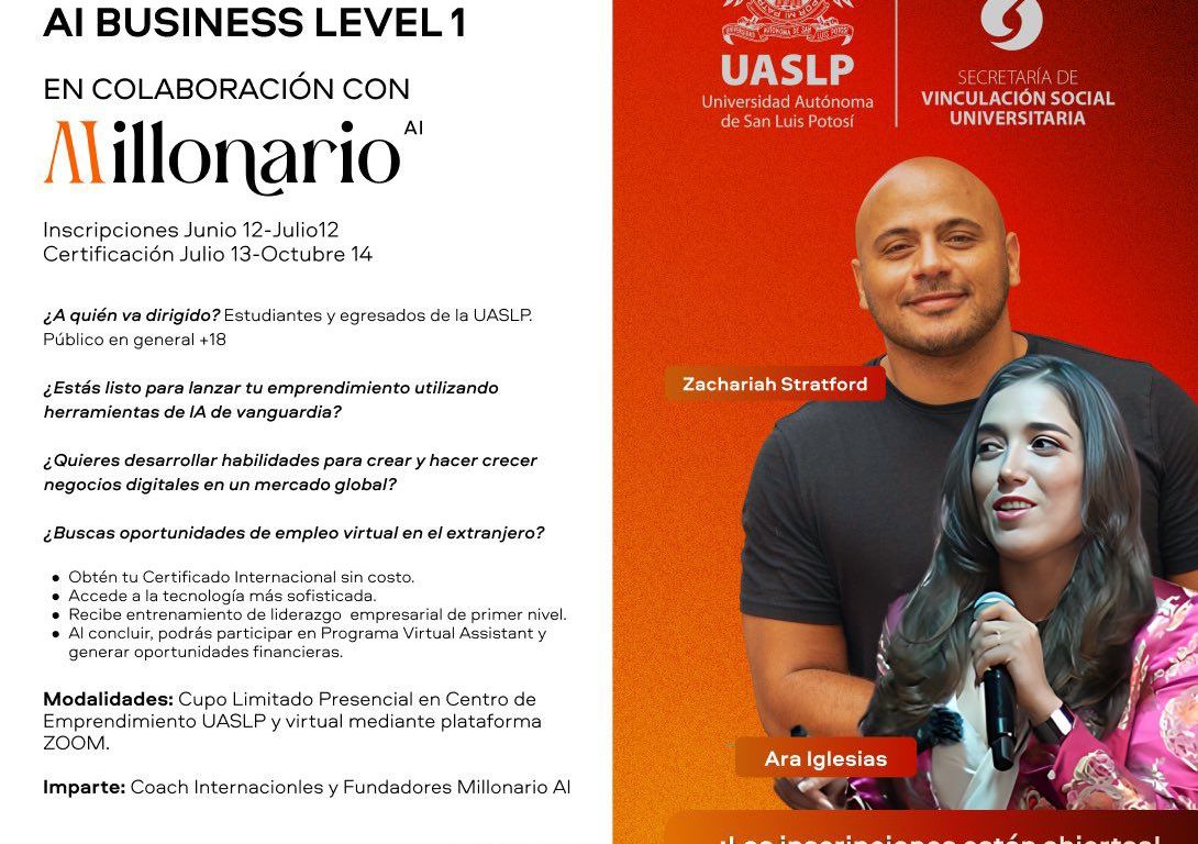 La Secretaría de Vinculación Social de la Universitaria de la Universidad Autónoma de San Luis Potosí (UASLP) impartirá la Certificación en Negocios AI Bussiness Level 1, programa diseñado para equipar a las y los participantes con las habilidades y conocimientos esenciales para triunfar en el entorno digital.