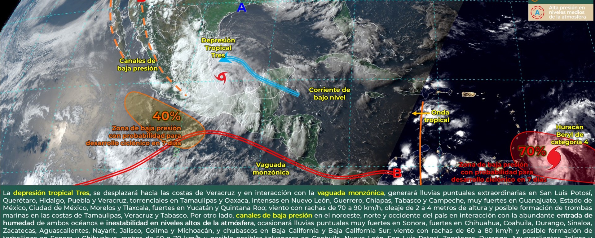 Cielo medio nublado a nublado durante el día, con lluvias puntuales torrenciales en San Luis Potosí, fuertes en Chihuahua, Durango, Nuevo León, Zacatecas y Aguascalientes; dichas lluvias podrían estar acompañadas de descargas eléctricas, rachas fuertes de viento, caída de granizo; además podrían reducir la visibilidad, ocasionar inundaciones, deslaves y encharcamientos, así como el incremento en los niveles de ríos y arroyos; chubascos en Coahuila. Ambiente fresco durante la mañana y por la tarde muy caluroso, así como extremadamente caluroso en Chihuahua. Viento de componente este de 10 a 25 km/h con rachas de 40 a 60 km/h y posibles tolvaneras en Chihuahua, Coahuila, Nuevo León, San Luis Potosí, Zacatecas, Durango y Aguascalientes.