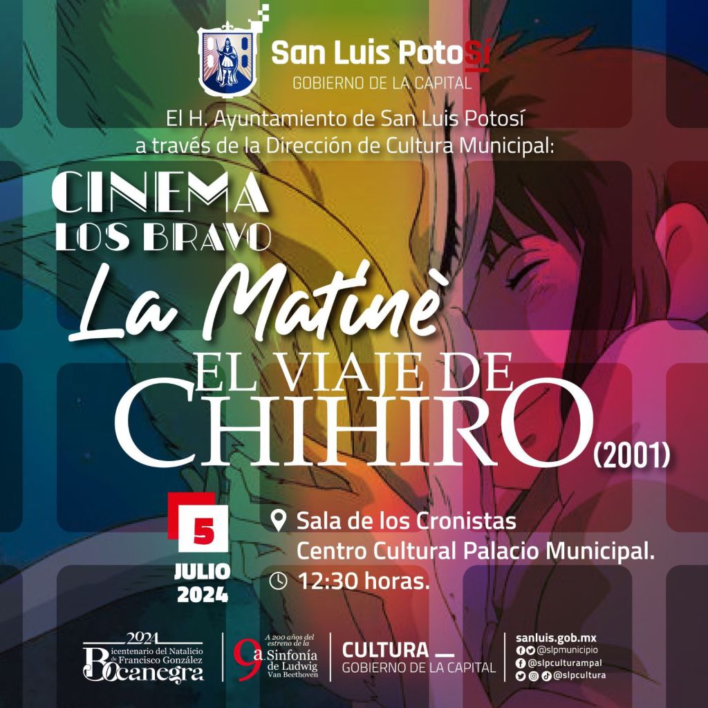 La Dirección de Cultura del Gobierno Municipal de San Luis Potosí se complace en invitar a disfrutar de una función especial en la Matiné de Cinema Los Bravo con la proyección de la aclamada película: «El viaje de Chihiro».