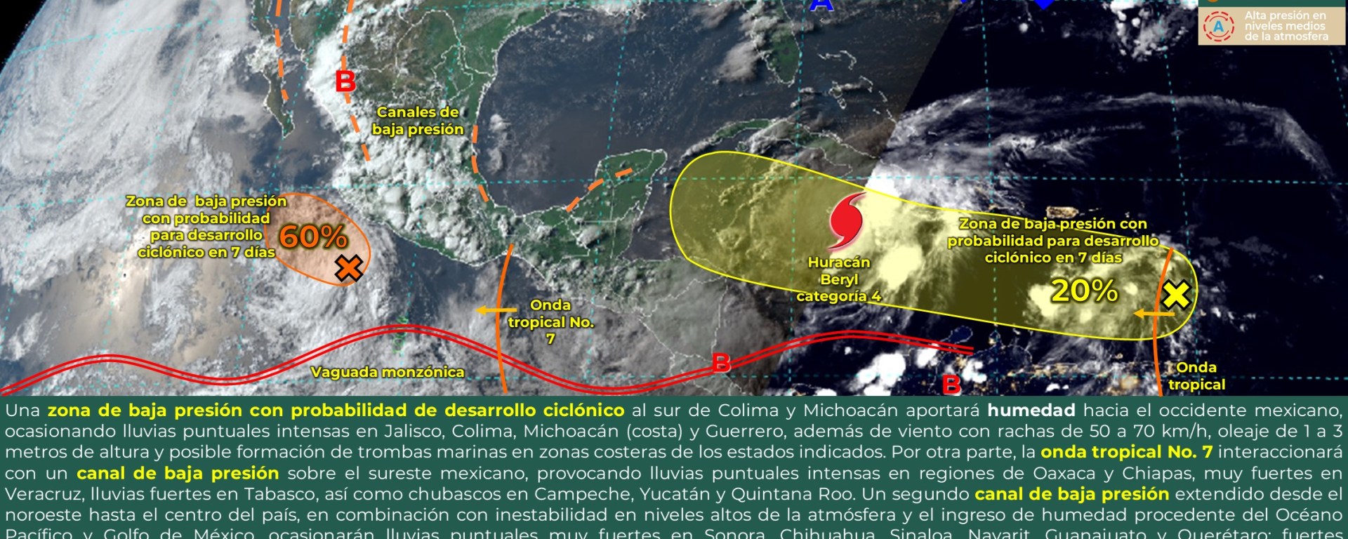 Intervalos de chubascos con lluvias puntuales fuertes (25 a 50 mm): Sinaloa, Colima, Michoacán, Guerrero, Oaxaca, Chiapas, Durango, Zacatecas, Aguascalientes, Guanajuato, Estado de México, Ciudad de México y Morelos.