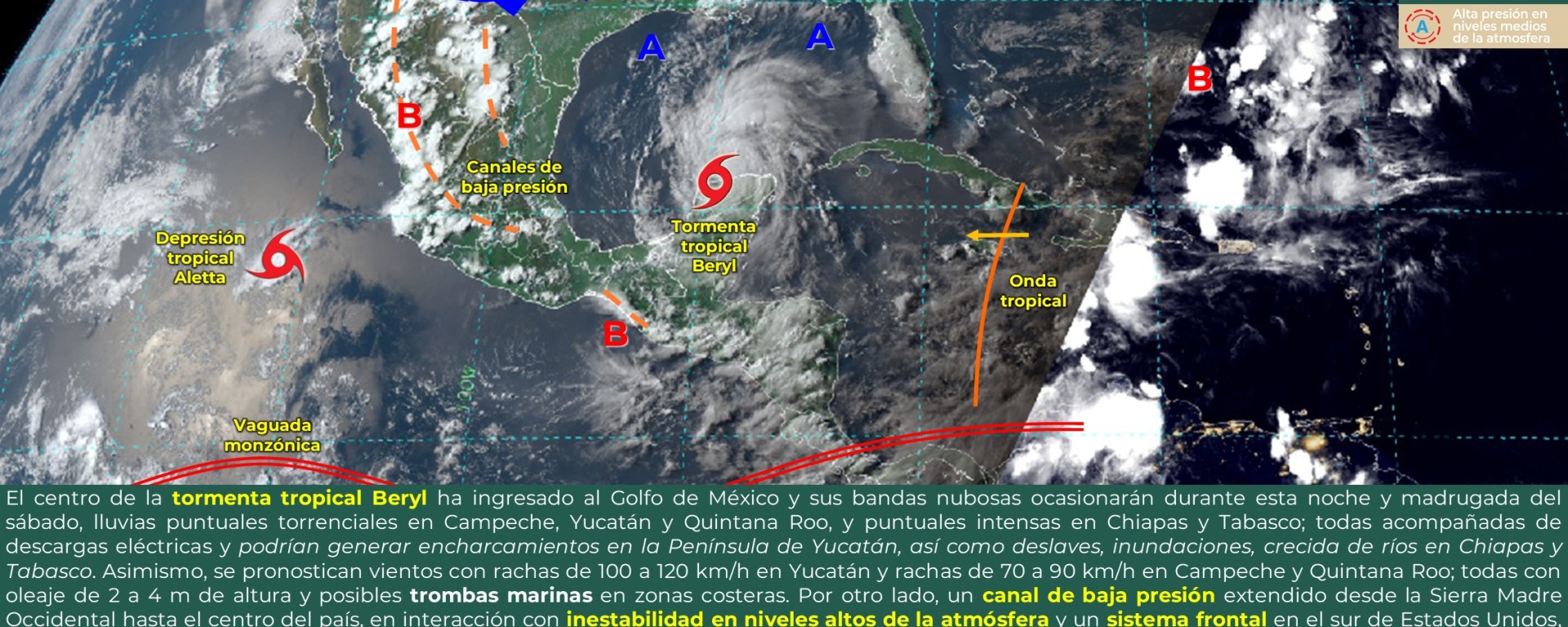 Viento con rachas de 50 a 70 km/h, oleaje de 1 a 3 metros de altura y posible formación de trombas marinas: costas de Tamaulipas, Veracruz (norte), Tabasco, Campeche y Yucatán.