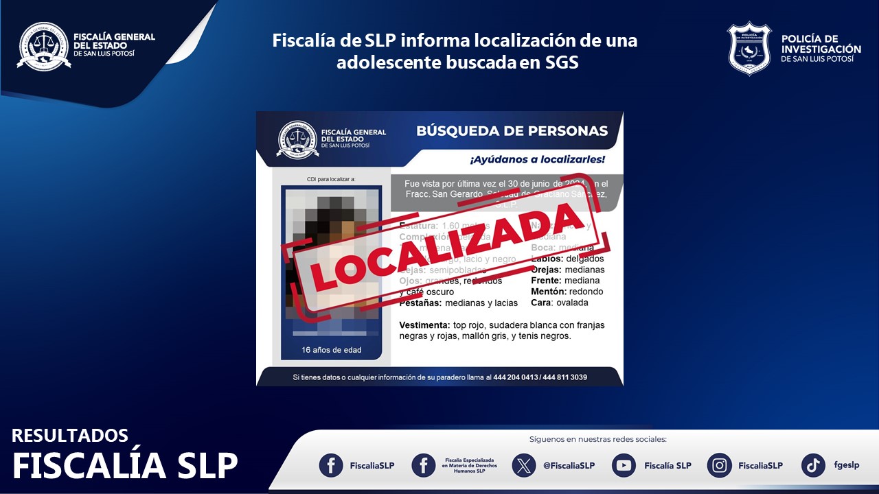 La Fiscalía General del Estado de San Luis Potosí (FGESLP) informó que Sofía, una adolescente de 16 años, quien contaba con ficha de búsqueda, fue localizada en Soledad de Graciano Sánchez.