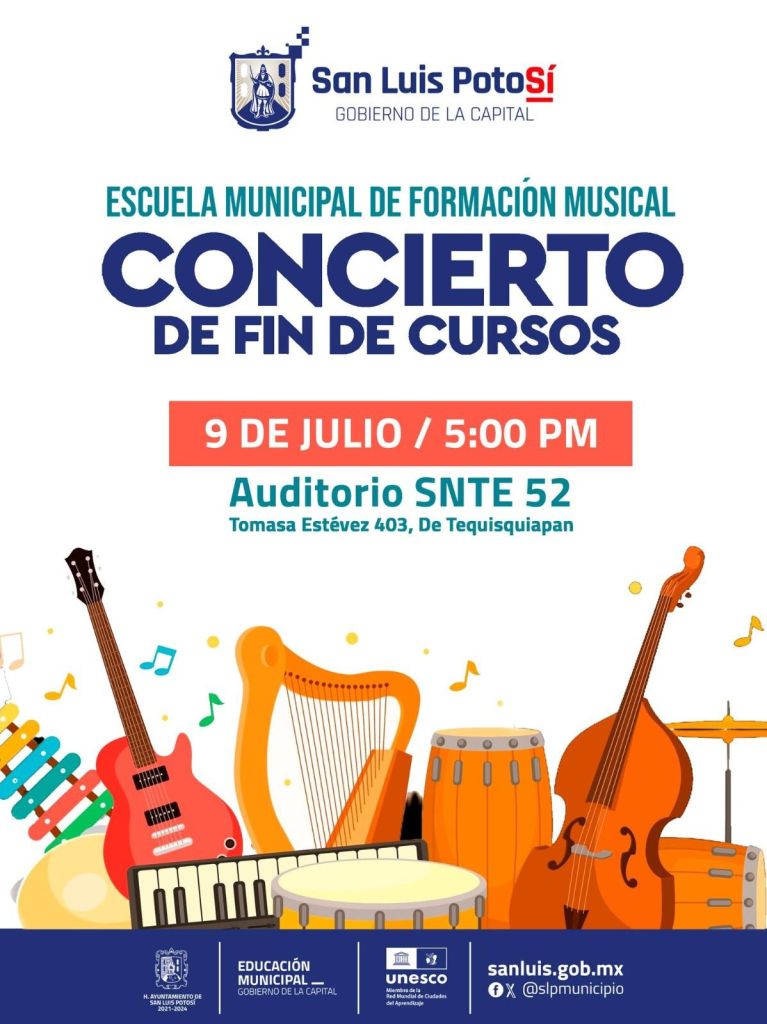 La Escuela Municipal de Formación Musical tiene preparado este gran Concierto de Fin de Cursos para el martes 09 de julio, en punto de las 5 de la tarde, el cual se llevará a cabo en el auditorio del SNTE de la sección 52, que se ubica en Tomasa Estévez 403, en el barrio de Tequisquiapan.