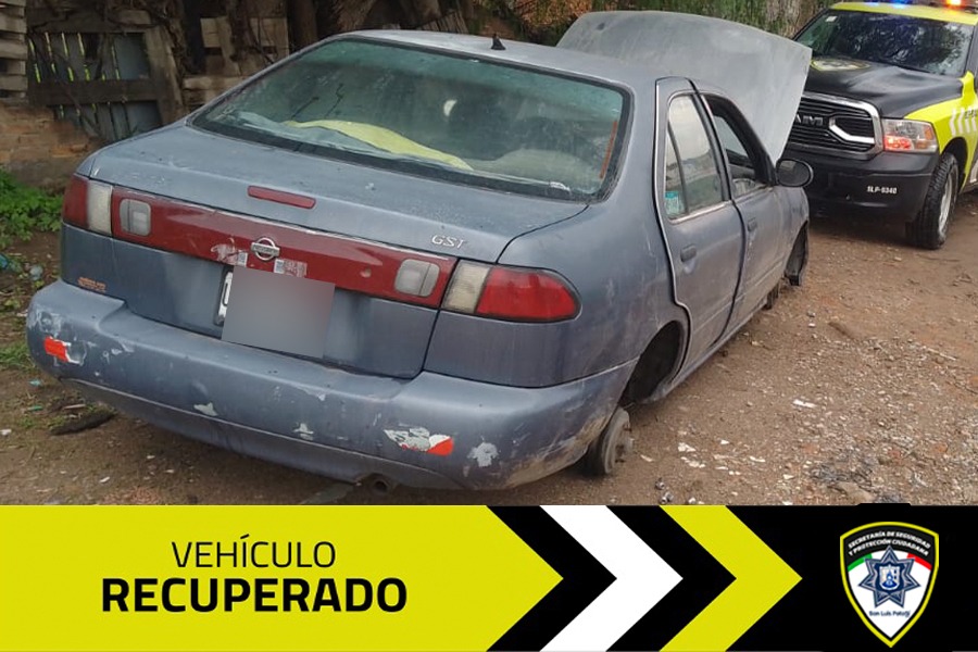 La primera unidad recuperada es un vehículo tipo sedán marca Nissan Sentra color azul, mismo que fue reportado en condiciones de abandono a través de radiofrecuencia, por lo que los oficiales acudieron a la calle Camino Viejo a Guanajuato y calle Aristóteles de la colonia Antorcha, donde efectivamente ubicaron el vehículo, mismo se encontraba abierto, sin batería y huellas de desvalijamiento.