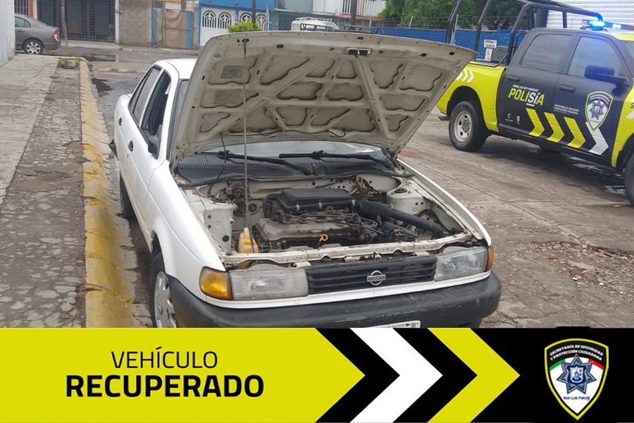 La primera unidad recuperada es un vehículo tipo sedán marca Nissan Sentra color azul, mismo que fue reportado en condiciones de abandono a través de radiofrecuencia, por lo que los oficiales acudieron a la calle Camino Viejo a Guanajuato y calle Aristóteles de la colonia Antorcha, donde efectivamente ubicaron el vehículo, mismo se encontraba abierto, sin batería y huellas de desvalijamiento.
