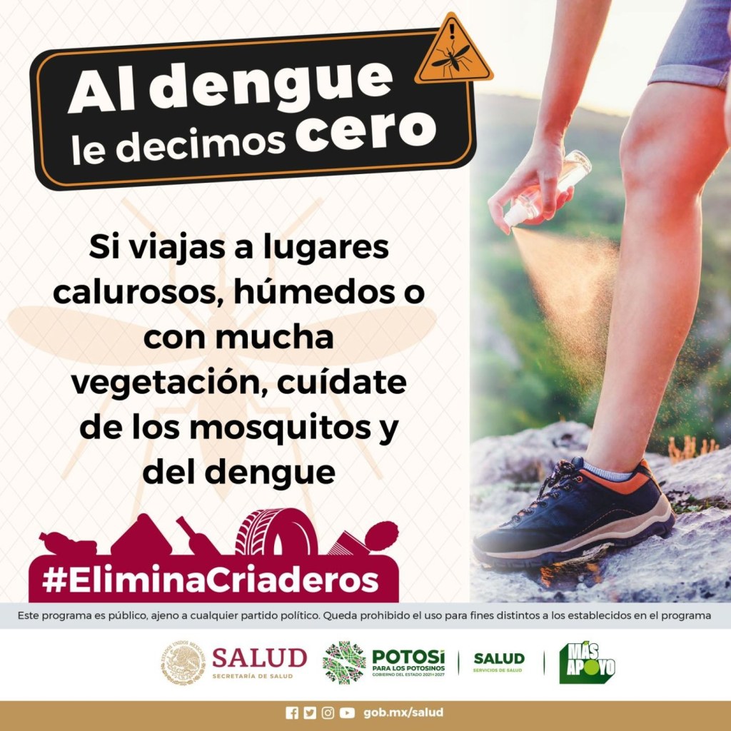 “Sí vives o viajas donde hay casos de dengue, debes realizar lo siguiente: cubrir la piel expuesta con camisas de manga larga, pantalones y sombreros; usar repelente como se indica en el producto; colocar mosquiteros y utilizar pabellones para dormir; dormir en lugares que estén protegidos con mosquiteros; evitar lugares infestados de mosquitos; lavar recipientes en los que se guarda el agua y taparlos; voltear cubetas y botellas, así como tirar lo que no sirva y pueda acumular agua; mantén puertas y ventanas cerradas. Y consultar al médico si se presenta fiebre luego de regresar de sus vacaciones o de su exposición”.