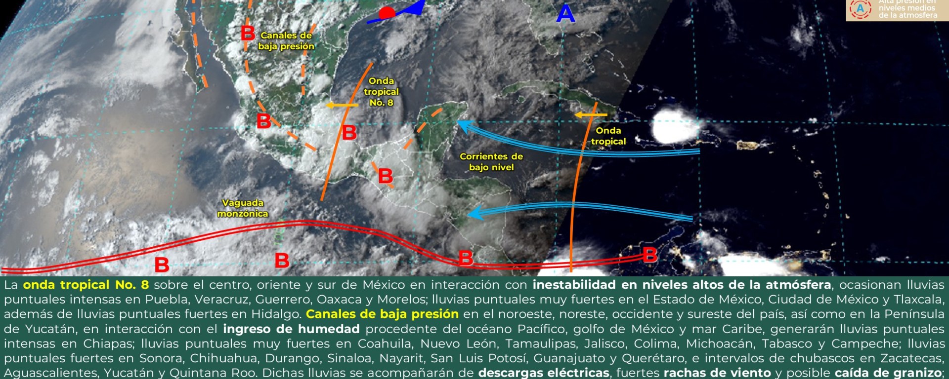 Intervalos de chubascos con lluvias puntuales fuertes (25 a 50 mm): Zacatecas, Aguascalientes, Guanajuato, Ciudad de México, Tlaxcala y Tabasco.