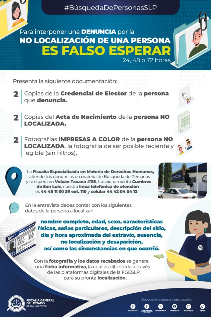 La Fiscalía General del Estado de San Luis Potosí (FGESLP) informó que, para realizar la denuncia por la no localización o desaparición de una persona, la población puede hacerlo a la brevedad ante las distintas unidades, agencias o delegaciones establecidas en la entidad.