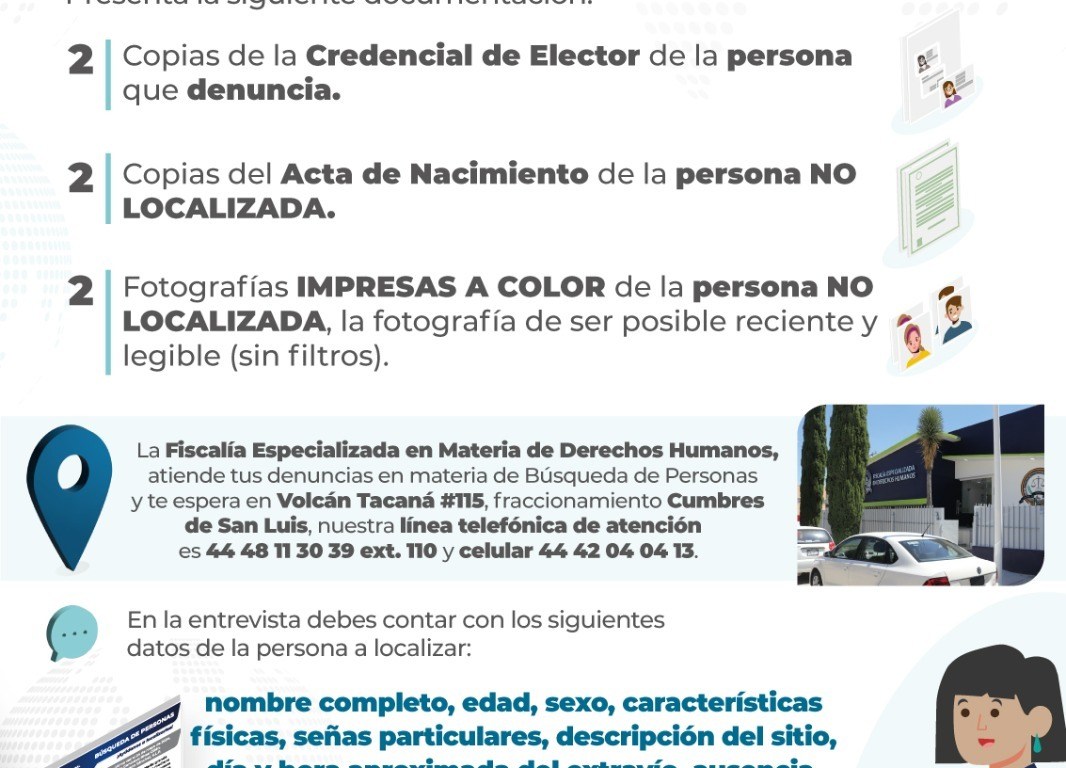 En ese sentido, con el objetivo de agilizar el trámite, la FGESLP puntualizó que para realizar la denuncia se deben presentar 2 copias de la credencial de elector del denunciante; 2 copias del acta de nacimiento y 2 fotografías de la persona no localizada, estas últimas, de ser posible, a color, legibles y sin filtro.