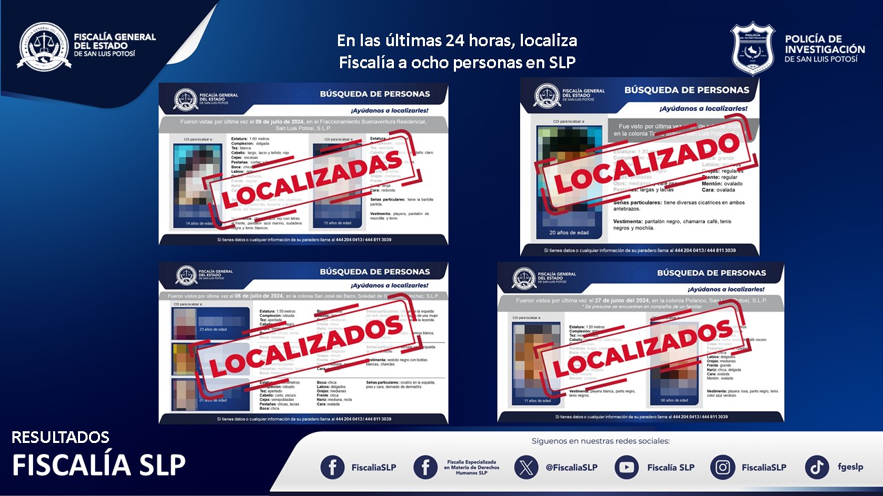 La Fiscalía General del Estado de San Luis Potosí (FGESLP) comunica que 8 personas han sido reencontradas con sus familias en las últimas 24 horas, gracias al trabajo del personal administrativo y operativo de la Fiscalía Especializada de Derechos Humanos y Policía de Investigación (PDI).