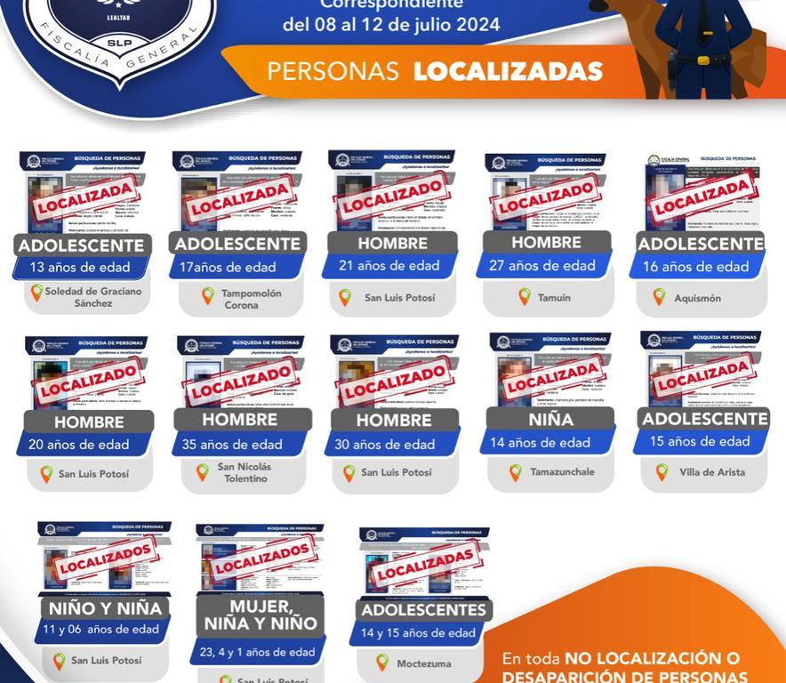 La Fiscalía General del Estado de San Luis Potosí (FGESLP), del 08 al 12 de julio del año en curso, logró localizar a 17 personas que contaban con ficha de búsqueda en la entidad potosina.