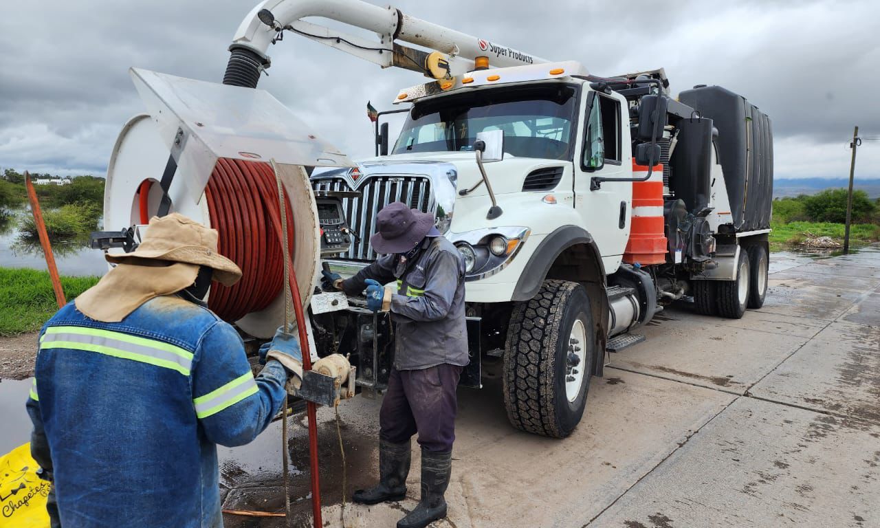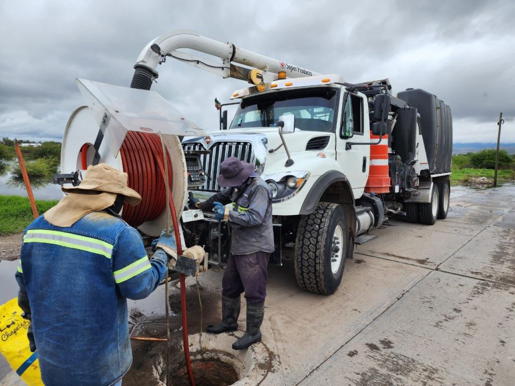 Con apoyo de un camión hidroneumático personal de la Dirección de Operación y Mantenimiento de Interapas, realizaron limpieza de calles y drenajes en la colonia Las mercedes, ya que al ser la parte más baja de la ciudad presenta encharcamientos a causa de las recientes lluvias.