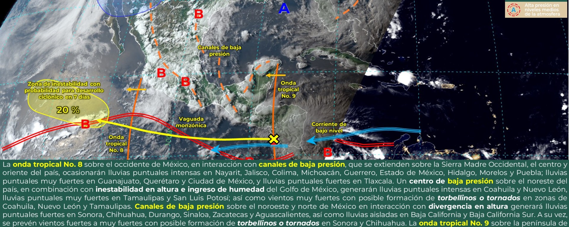 Cielo medio nublado a nublado con lluvias puntuales intensas en Durango y Zacatecas, lluvias puntuales muy fuertes en Aguascalientes, y lluvias puntuales muy fuertes en Chihuahua, Coahuila, Nuevo León y San Luis Potosí; todas con descargas eléctricas y posible caída de granizo, las cuales podrían reducir la visibilidad, ocasionar inundaciones y deslaves, así como incrementar los niveles de ríos y arroyos. Ambiente vespertino cálido, y caluroso en zonas de Chihuahua, Coahuila y Nuevo León. Durante la mañana, ambiente templado, y fresco con bancos de niebla en zonas serranas. Viento del este y noreste de 15 a 30 km/h en la región, con rachas de 50 a 70 km/h en Chihuahua, Coahuila, Nuevo León, San Luis Potosí y Zacatecas, y rachas de 40 a 60 km/h en Durango y Aguascalientes.