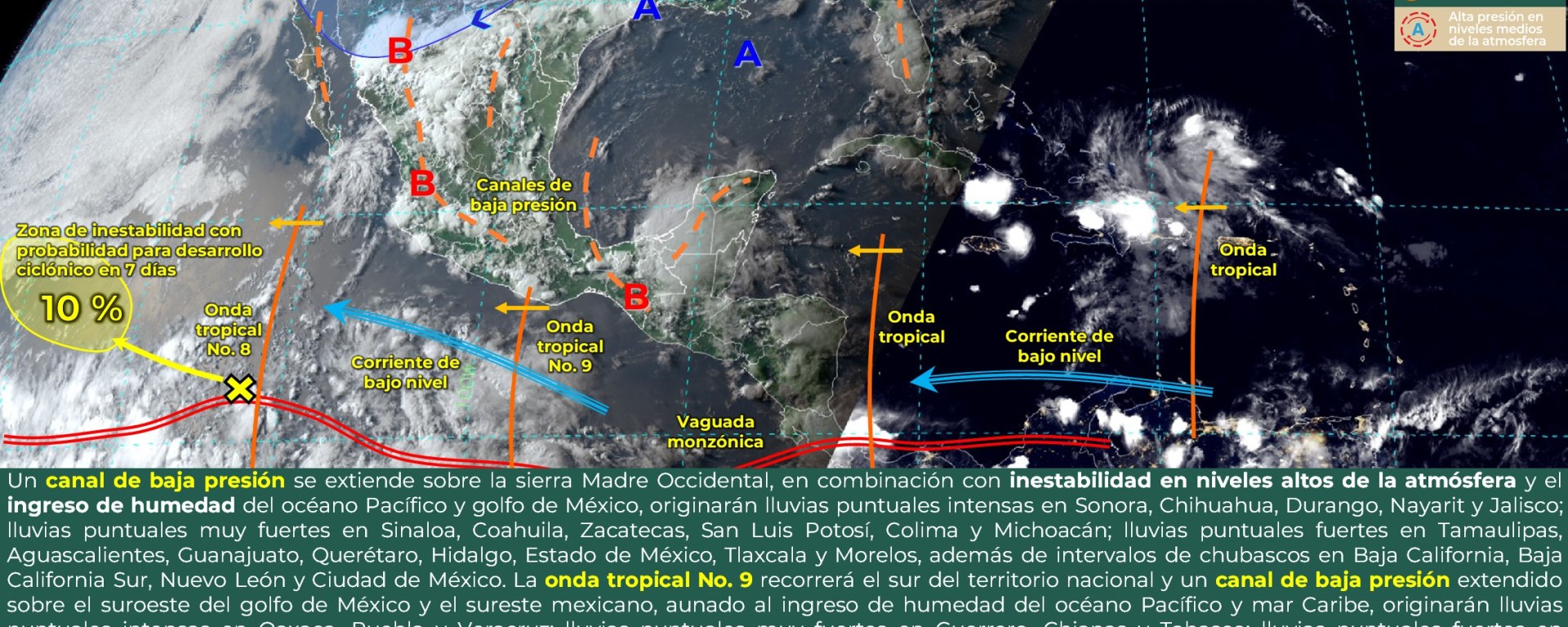 Lluvias fuertes con puntuales muy fuertes (50 a 75 mm): Sonora, Chihuahua, Coahuila, Durango, Sinaloa, Nayarit, Jalisco, Colima, Michoacán, Guerrero, Oaxaca, Chiapas, Veracruz y Tabasco.
