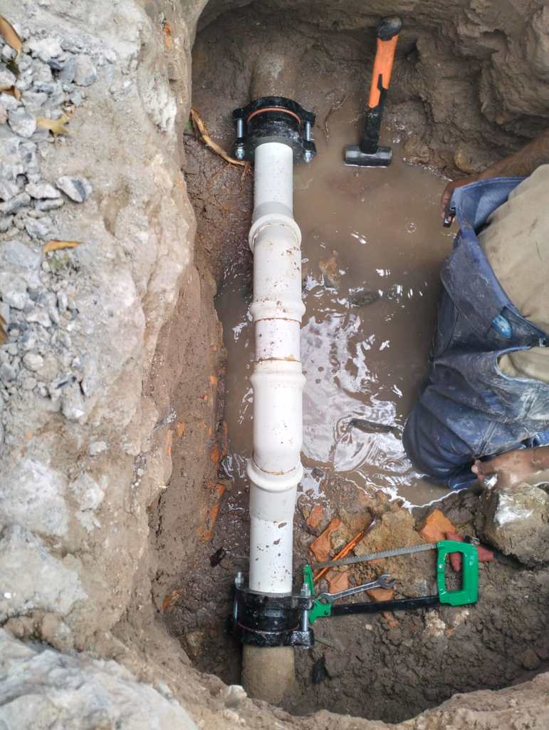 Pero en dicho punto los trabajadores que reconstruían el ducto del drenaje se percataron de la fuga de agua de un tubo de asbesto de tres pulgadas que tenía una perdida significativa y que justamente se juntaba con el drenaje sanitario.
