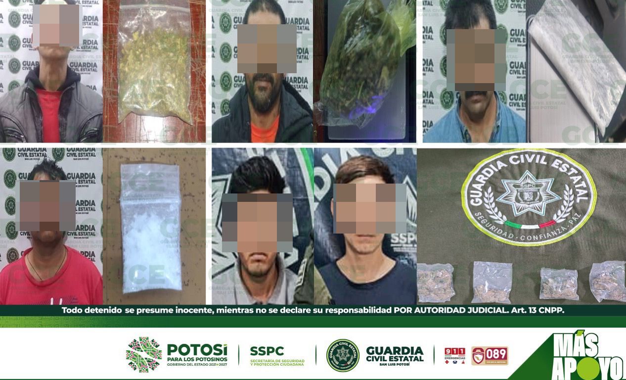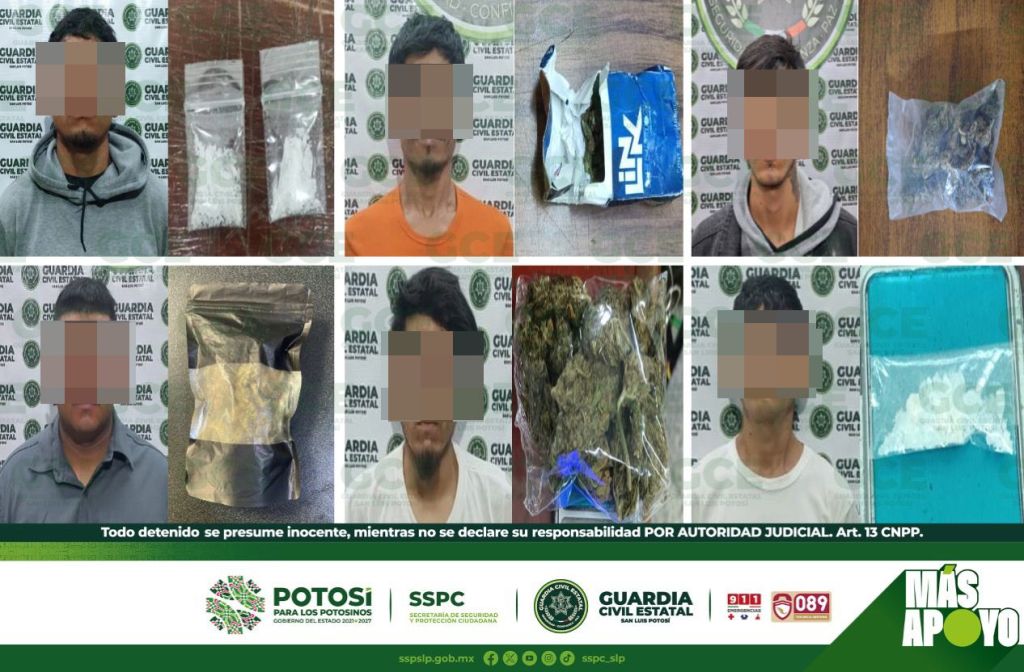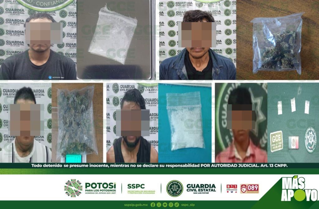 En la capital potosina, se detuvo a: Miguel “N” de 39 años de edad, luego de ser ubicado en la colonia Satélite, con una dosis de marihuana; Humberto “N” de 31 años, fue descubierto en la colonia Ricardo B. Anaya, con dos dosis de “cristal”; mientras que en la colonia Prados Glorieta, Gabriel “N” de 44 años, fue asegurado con una dosis de marihuana; Javier “N” de 55 años, fue descubierto en el Barrio de Santiago, con una dosis de marihuana. Acciones operativas en la colonia Praderas del Real, derivaron en la detención de Carlos “N” de 31 años de edad, a quien se le aseguraron cuatro dosis de “cristal”;