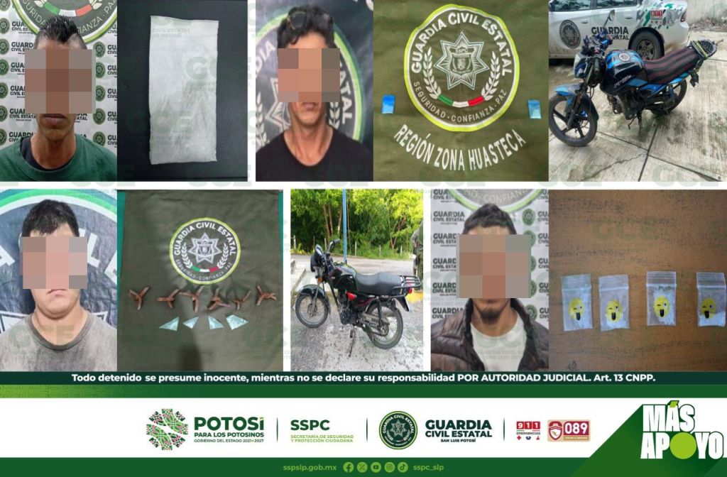 Por su parte, en el municipio de Ciudad Valles, en la colonia Infonavit II, se detuvo a Edgar “N” de 30 años y a Alejandro “N” de 29 años, con cuatro dosis de marihuana; en la zona centro de este municipio se ubicó a Cipriano “N” de 27 años, con cuatro dosis de “cristal”, seis objetos de varilla conocidos como “poncha llantas” y una motocicleta; también fue detenido Edison “N” de 43 años de edad, tras los operativos en el municipio de Axtla de Terraza, el presunto fue asegurado con dos dosis de “cristal”.