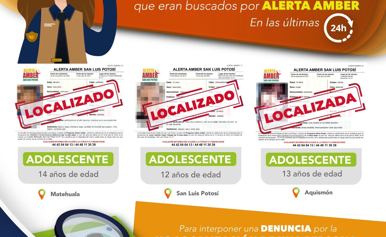 Primero la Coordinación de Alerta Amber, informó que Lucio de 12 años de edad, quien era buscado desde el 15 de julio, ya estaba de regreso en su hogar, al igual que Blanca de 13 años, de quien perdieron contacto con ella el 5 de julio de 2024 en Aquismón.