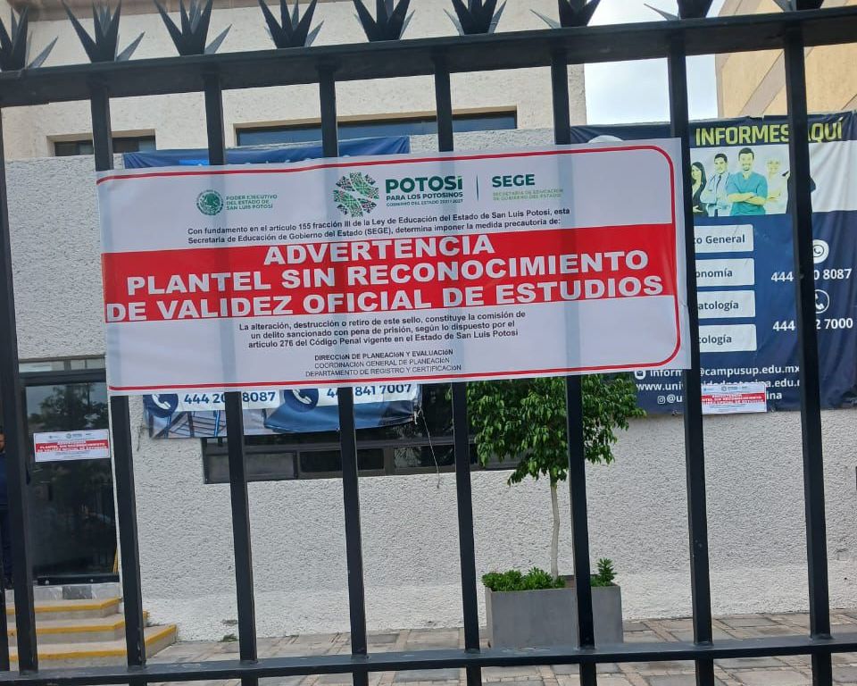 En seguimiento a la visita de vigilancia extraordinaria iniciada por el Poder Ejecutivo a través de la Secretaría de Educación de Gobierno del Estado (SEGE) en contra de la persona moral Universidad Potosina S.C., este jueves fueron colocados sellos de advertencia de que dicho plantel no cuenta con un Reconocimiento de Validez Oficial de Estudios (RVOE), que respaldara legalmente el publicitar e impartir estudios de nivel superior, de las carreras de Licenciatura en Médico General, Licenciatura en Gastronomía, Licenciatura en Estomatología y Licenciatura en Psicología.