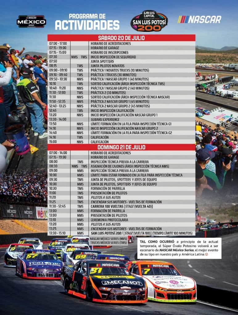 Las carreras estelares tendrán se realizarán el domingo 21 de julio en el Super Ovalo Potosino, iniciando actividades técnicas desde las 8:00 horas, aunque las carreras «100 vueltas» y «San Luis Potosí 200» serán a las 11:30 y 13:30 Hrs. respectivamente.